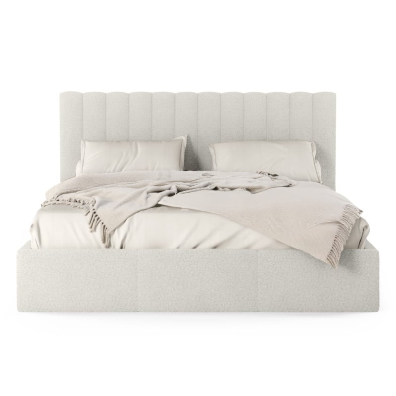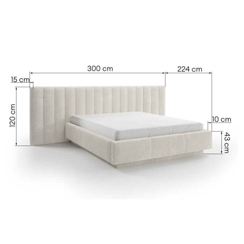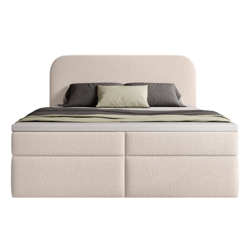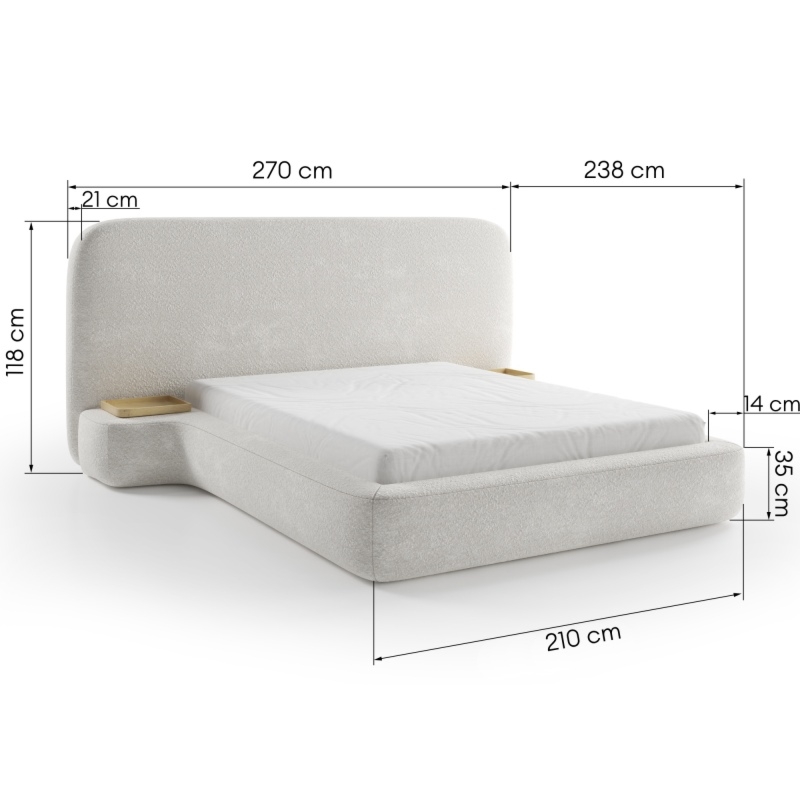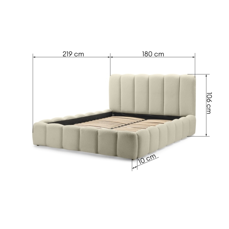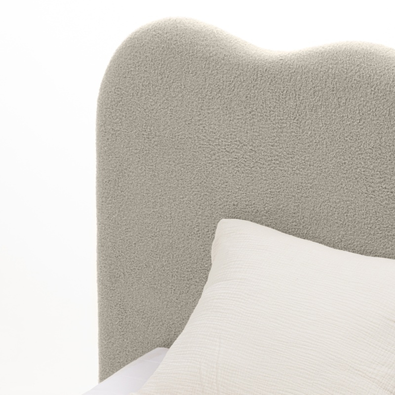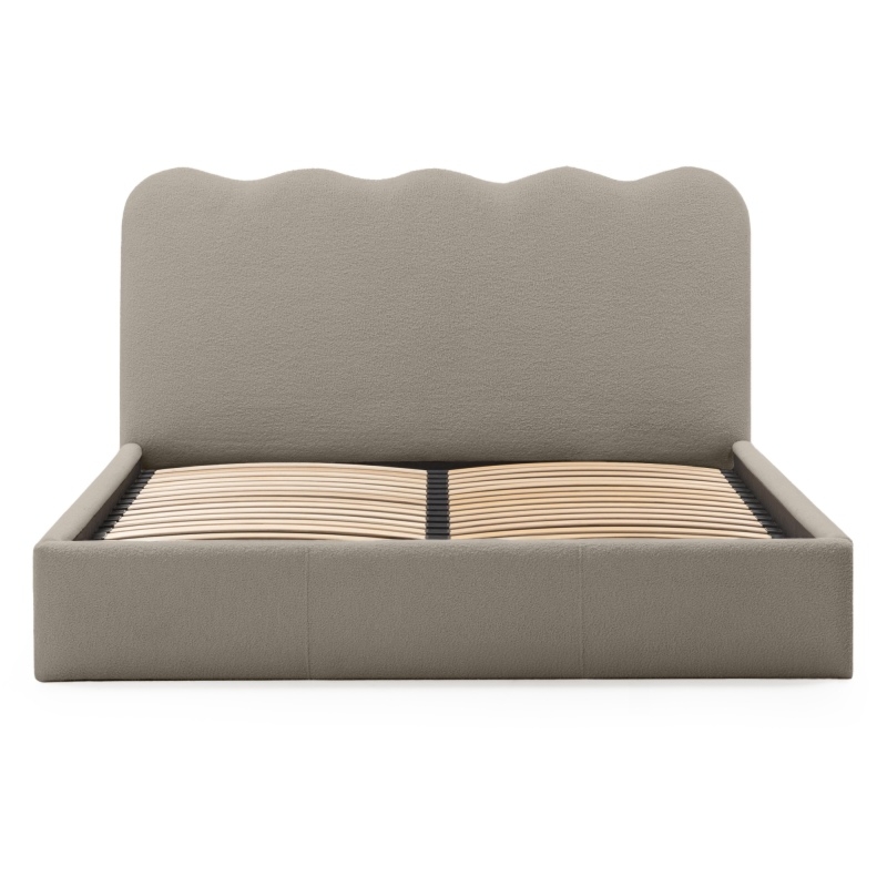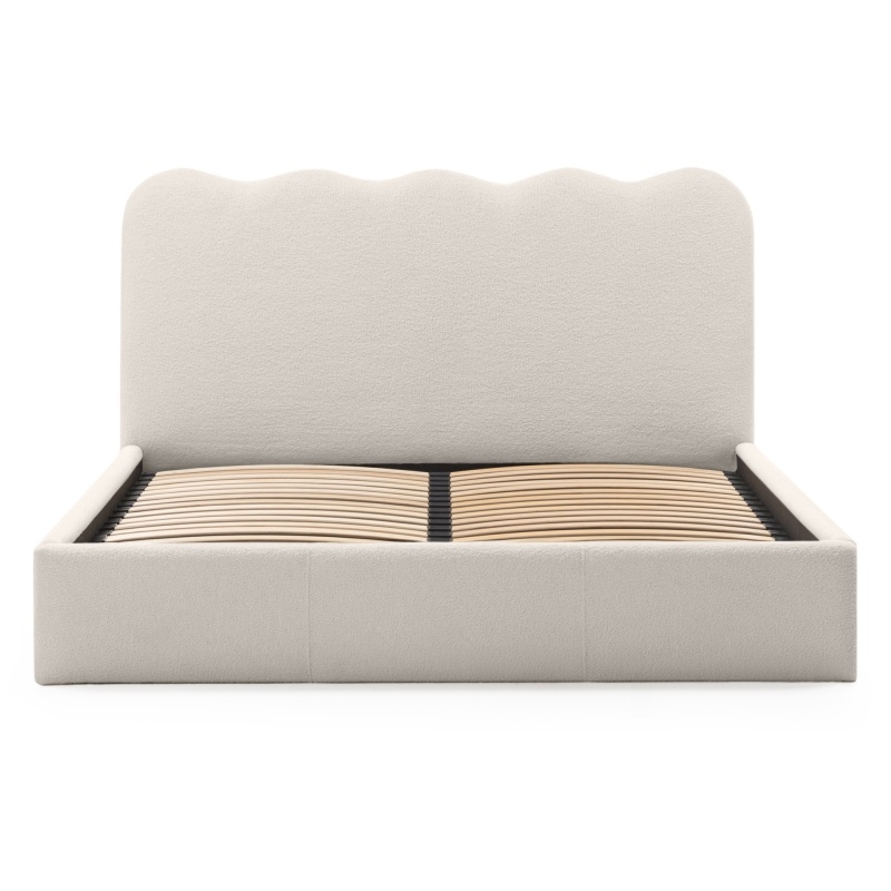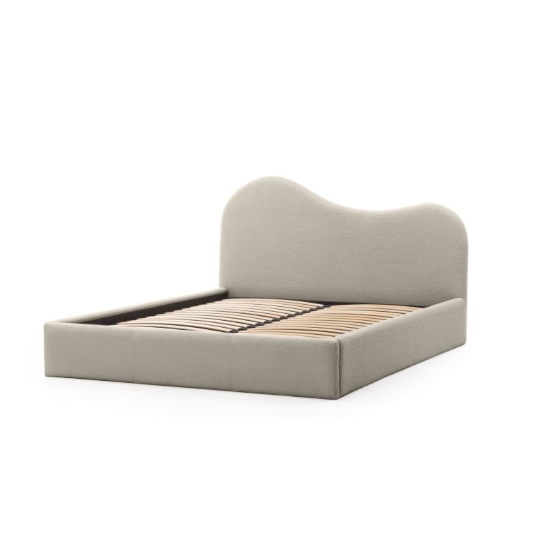 Łóżko Bolge wprowadzi nową jakość komfortu i stylu do Twojej sypialni. Jego zagłówek urzeka subtelnymi, falistymi liniami, które nadają mu unikalną, organiczną formę. Niezwykle miękka tkanina boucle w beżowym odcieniu, tworzy ciepły i przytulny klimat, który sprzyja relaksowi. Ponadto materiał ten powstał z przędzy wyprodukowanej z recyklingowanych tworzyw, co przyczynia się do ochrony naszego wspólnego środowiska.