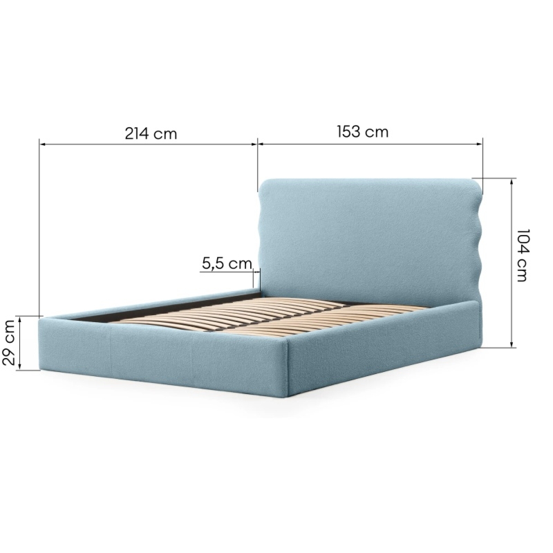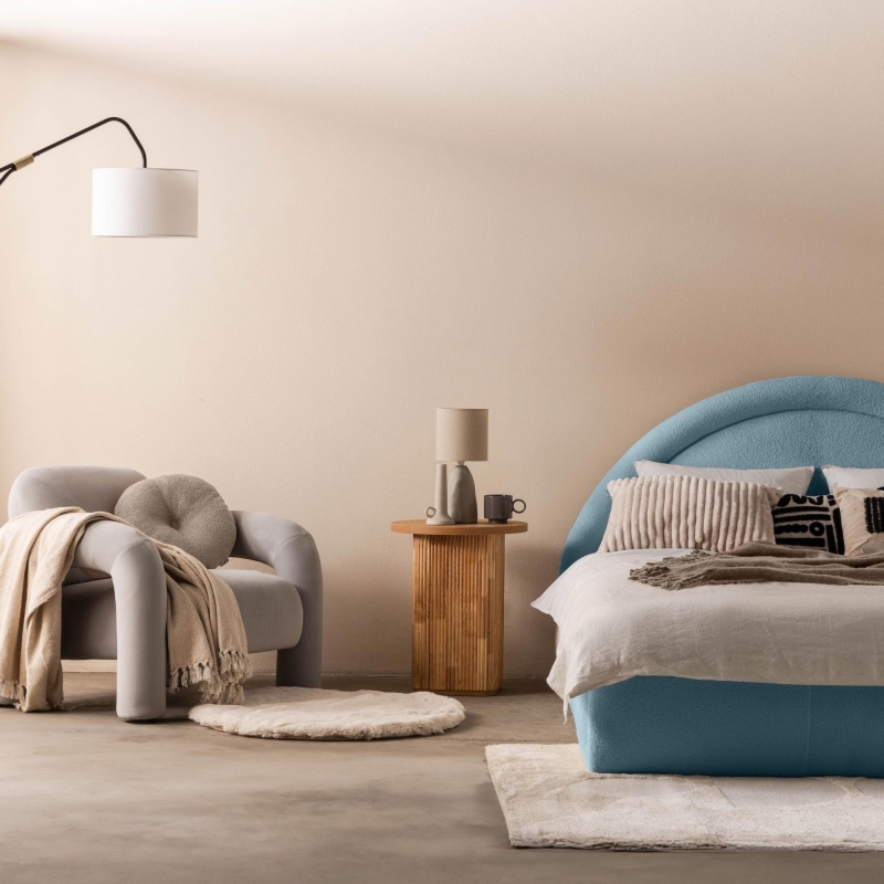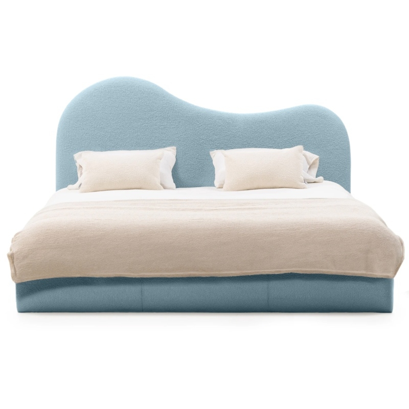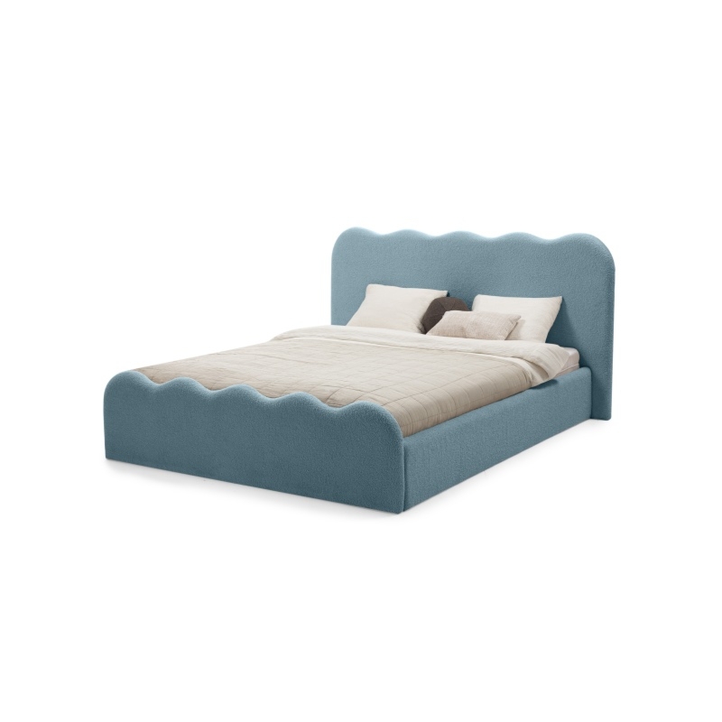 Łóżko Bolge wprowadzi nową jakość komfortu i stylu do Twojej sypialni. Jego zagłówek urzeka subtelnymi, falistymi liniami, które nadają mu unikalną, organiczną formę. Niezwykle miękka tkanina boucle w niebieskim odcieniu, tworzy ciepły i przytulny klimat, który sprzyja relaksowi. Ponadto materiał ten powstał z przędzy wyprodukowanej z recyklingowanych tworzyw, co przyczynia się do ochrony naszego wspólnego środowiska.
