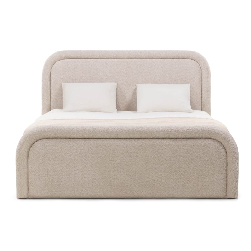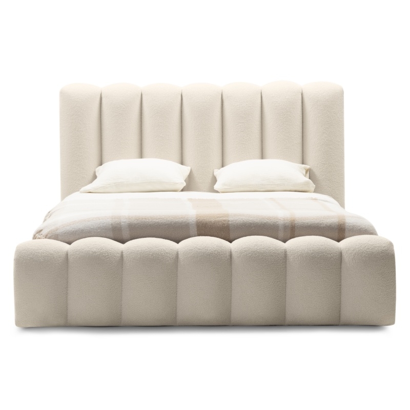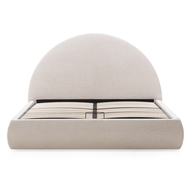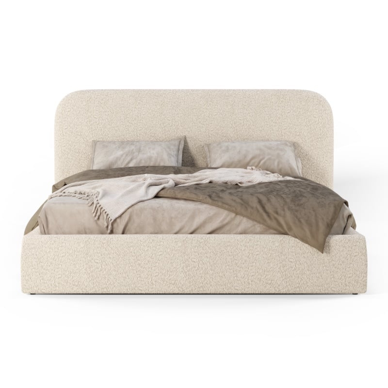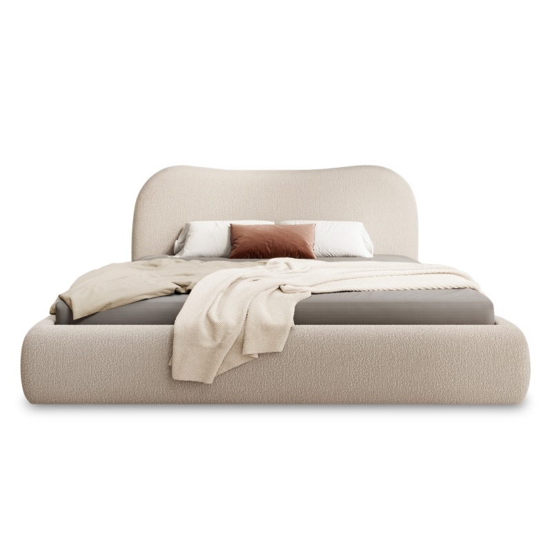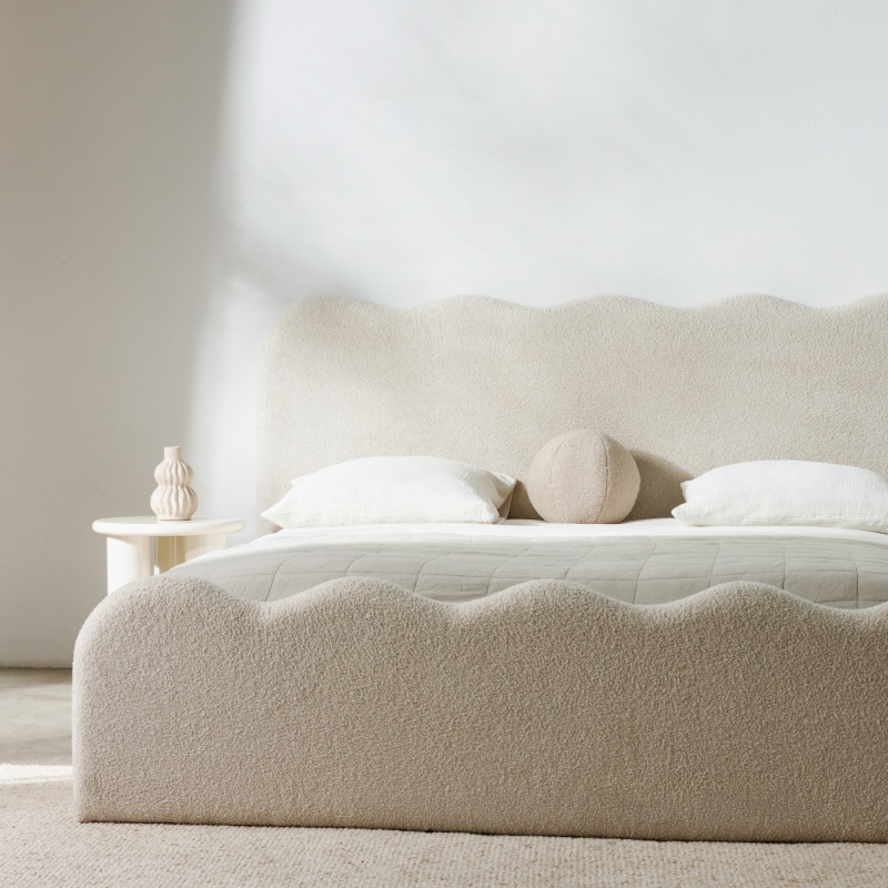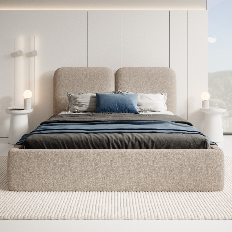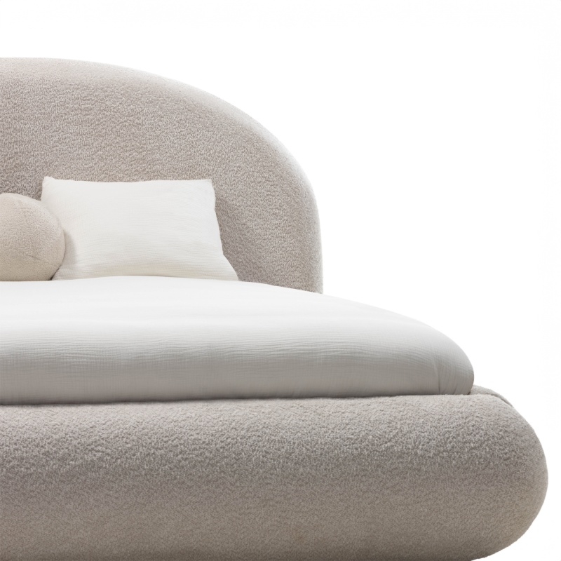 Łóżko Moona wyróżnia się niezrównanym komfortem i wyjątkowym designem. Jego obłe kształty i beżowa tapicerka boucle nadają wnętrzu lekkości i elegancji, wprowadzając jednocześnie nutę nowoczesności. Mebel stanie się centralnym punktem każdej sypialni, niezależnie od tego, czy preferujesz minimalistyczny, czy bardziej klasyczny styl.