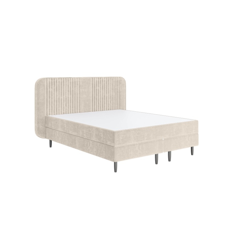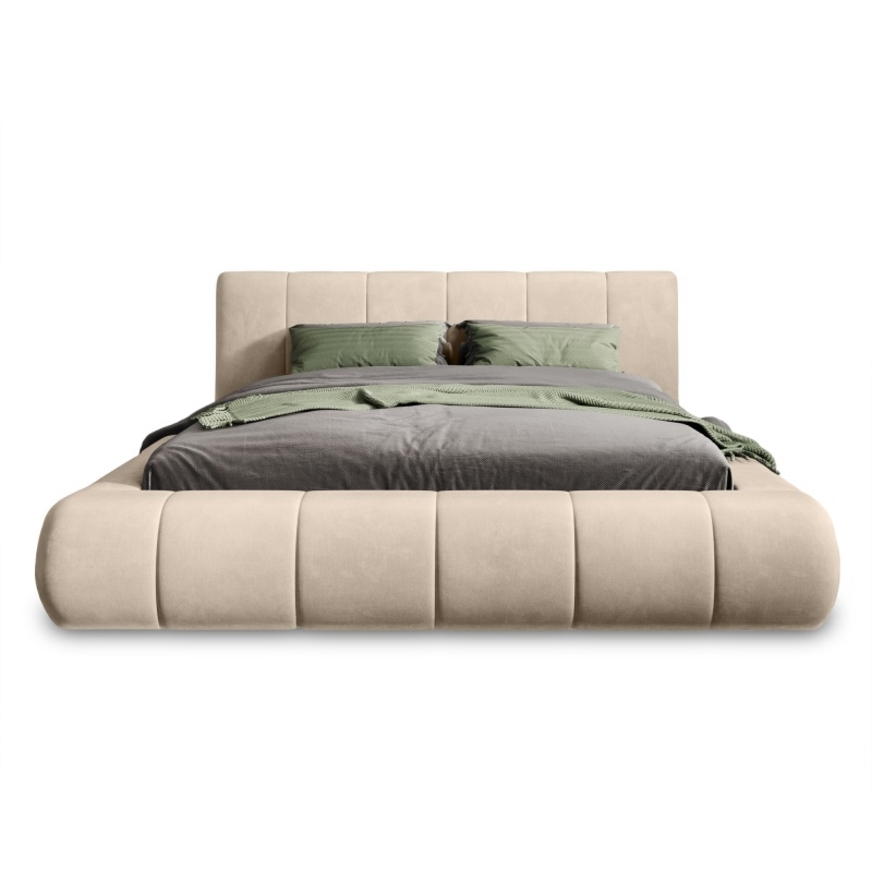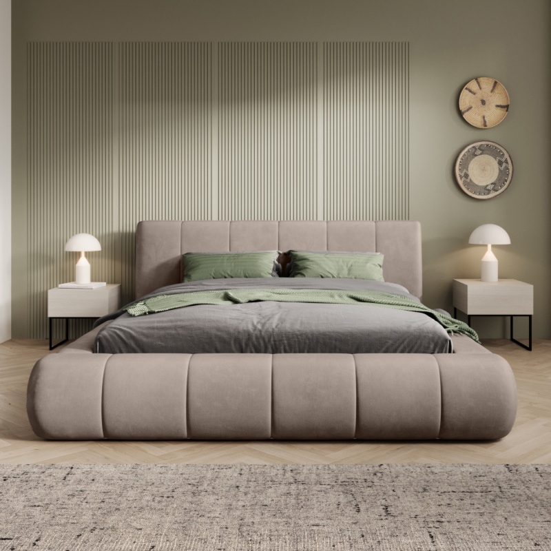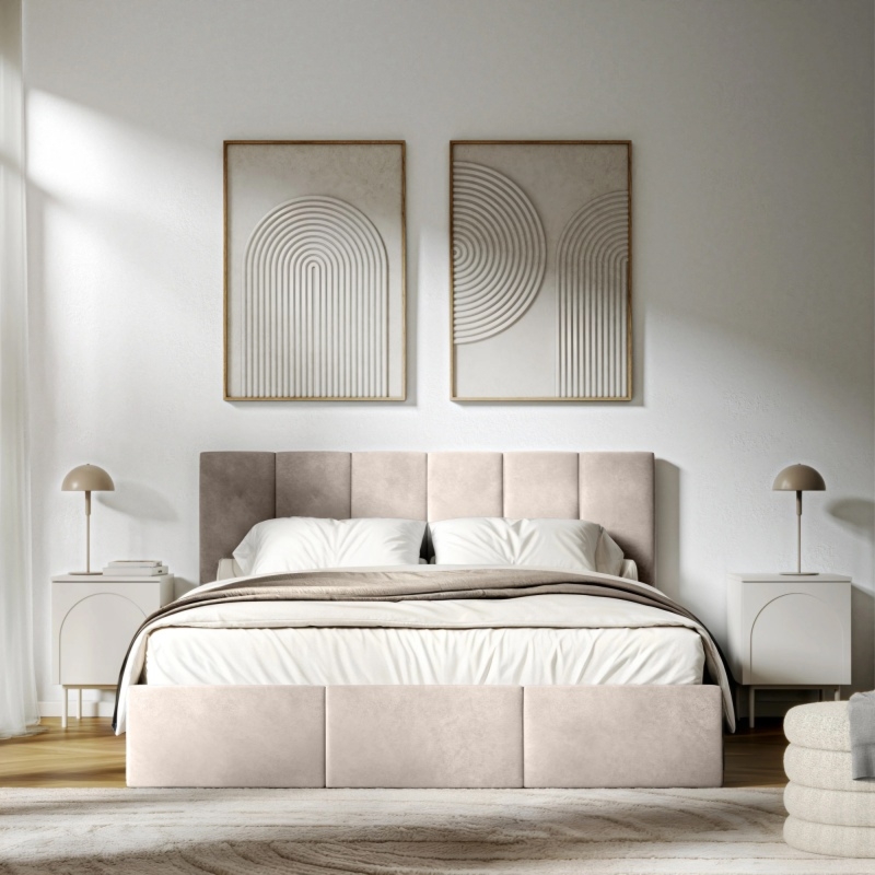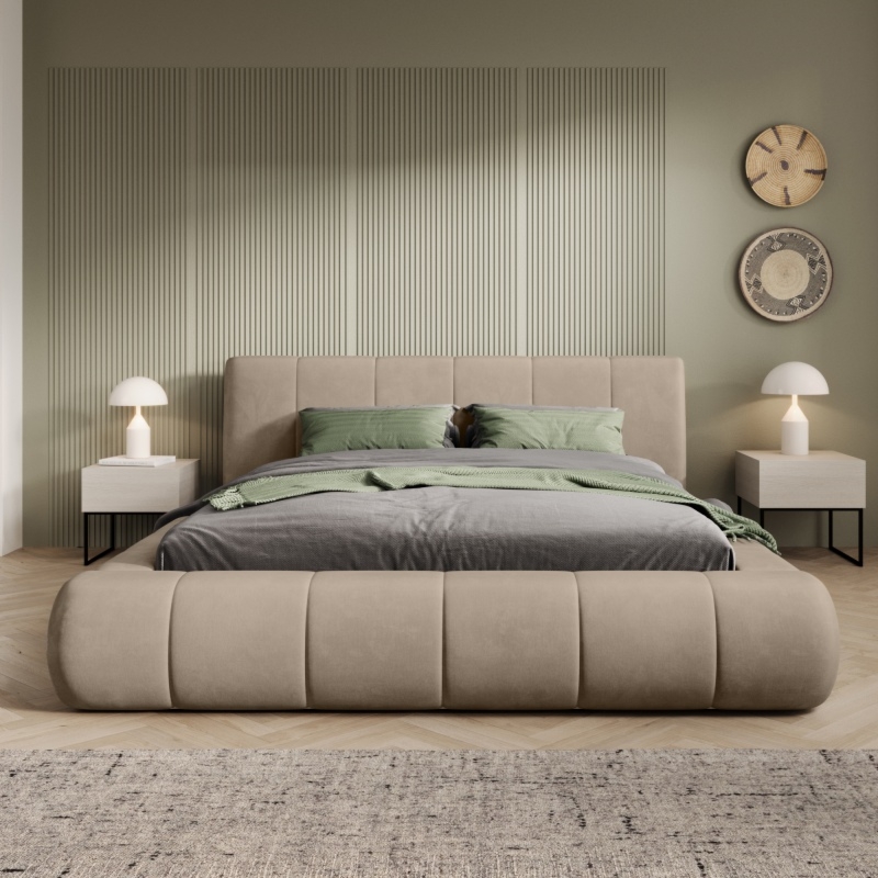 Łóżko Zeni to idealne połączenie nowoczesnego designu z klasyczną elegancją. Obite miękką, welurową tkaniną w jasnobeżowym odcieniu, wprowadza do sypialni lekkość i harmonię, pasując zarówno do wnętrz minimalistycznych, jak i tych bardziej klasycznych.
