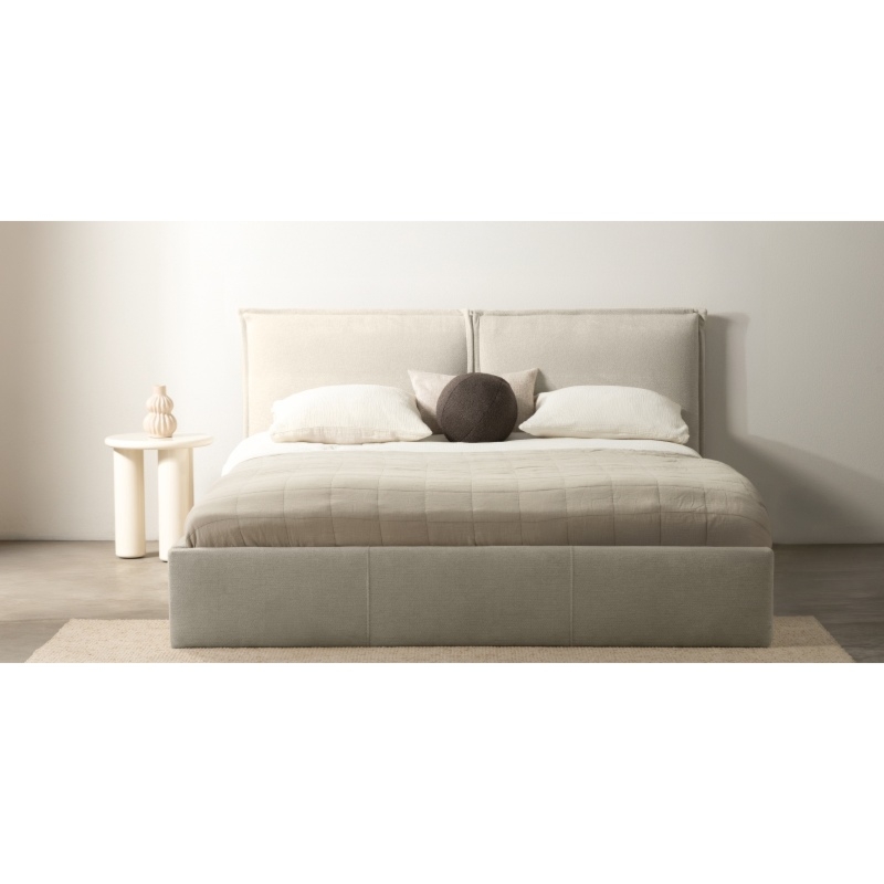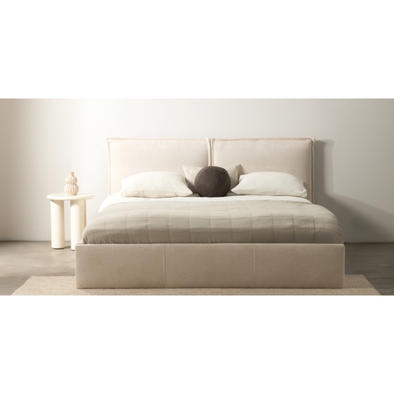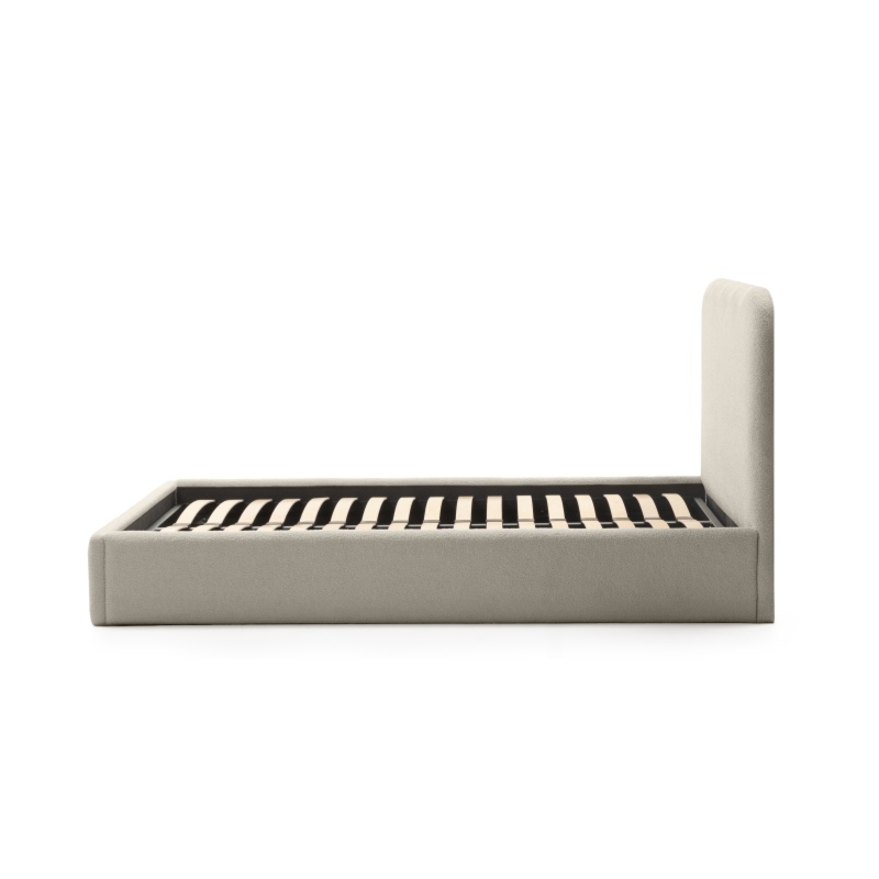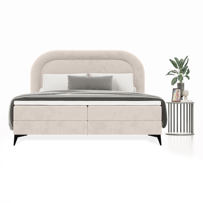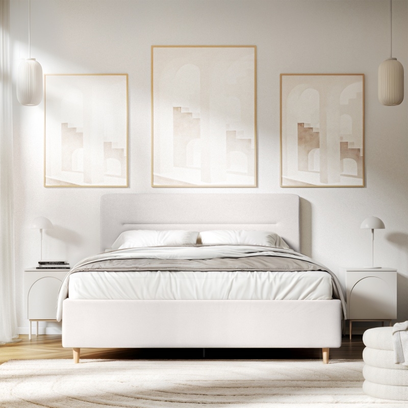Łóżko Ovoid wyróżnia się wysokim zagłówkiem oraz weznóżem, które dzięki swoim zaokrąglonym kształtom, dodają wnętrzu przytulności. Wbudowany pojemnik ułatwia przechowywanie pościeli, a metalowy stelaż z elastycznymi listwami zapewnia doskonałe podparcie materaca, gwarantując zdrowy i spokojny sen. Beżowy kolor doskonale komponuje się z różnymi aranżacjami, a przyjemna w dotyku tkanina podnosi komfort użytkowania.