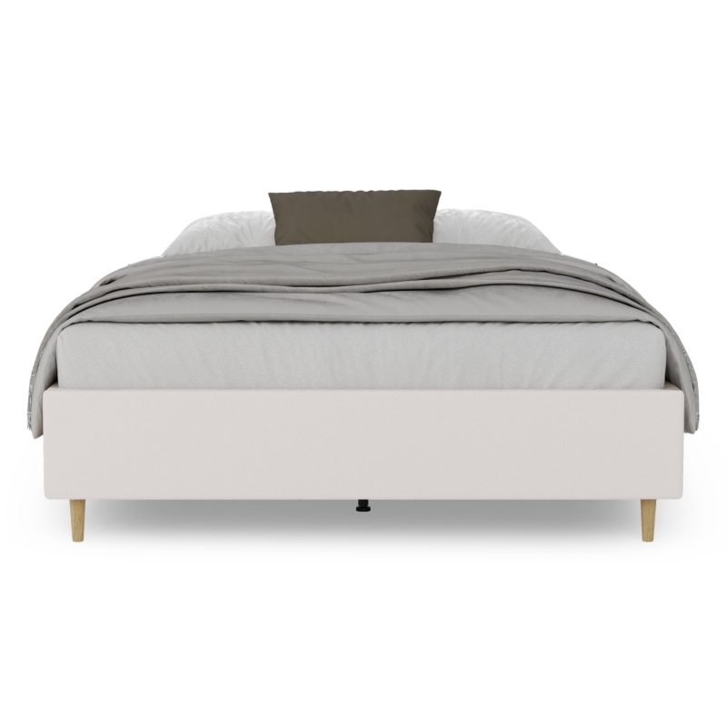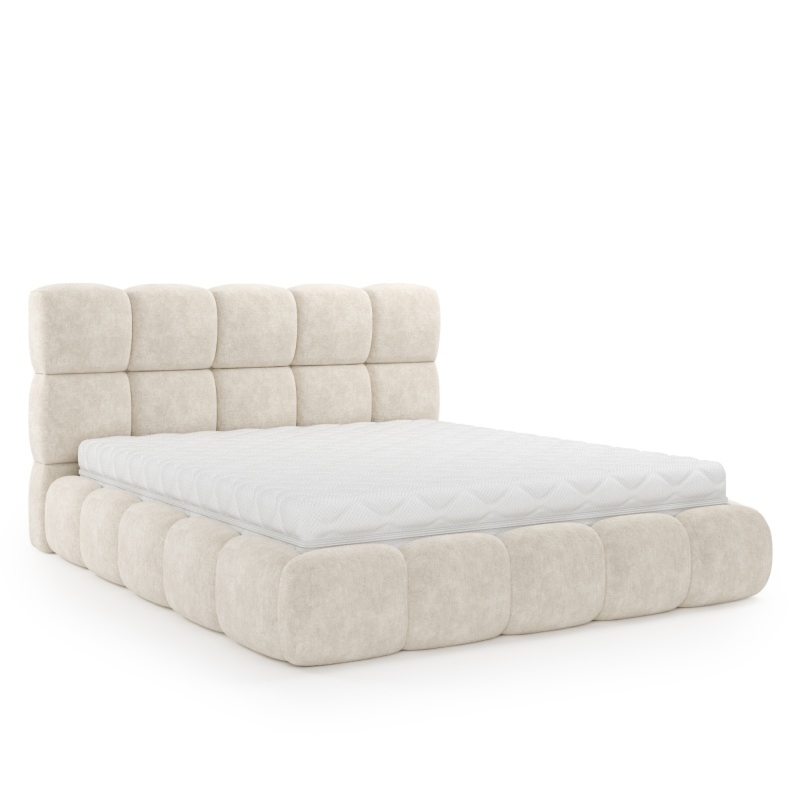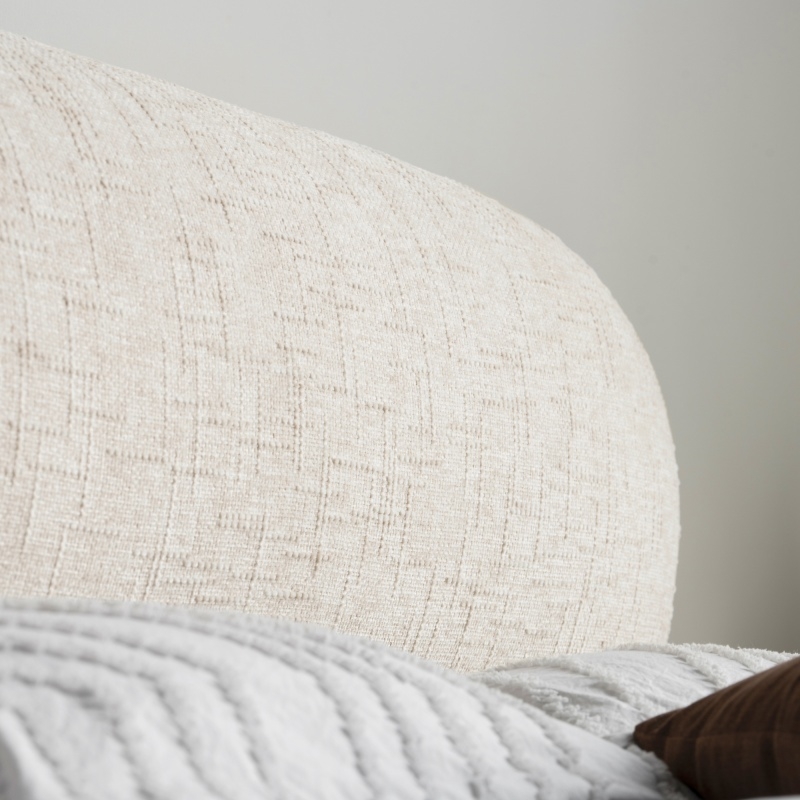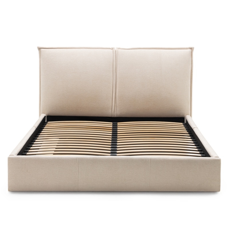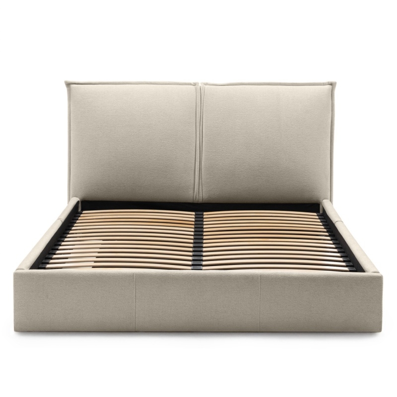Łóżko Ovoid wyróżnia się wysokim zagłówkiem oraz weznóżem, które dzięki swoim zaokrąglonym kształtom, dodają wnętrzu przytulności. Wbudowany pojemnik ułatwia przechowywanie pościeli, a metalowy stelaż z elastycznymi listwami zapewnia doskonałe podparcie materaca, gwarantując zdrowy i spokojny sen. Beżowy kolor doskonale komponuje się z różnymi aranżacjami, a przyjemna w dotyku tkanina podnosi komfort użytkowania.