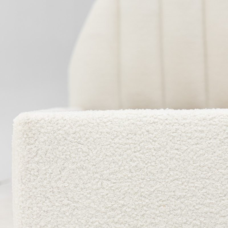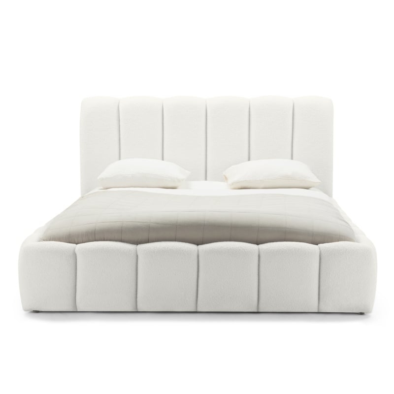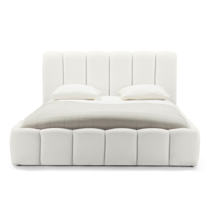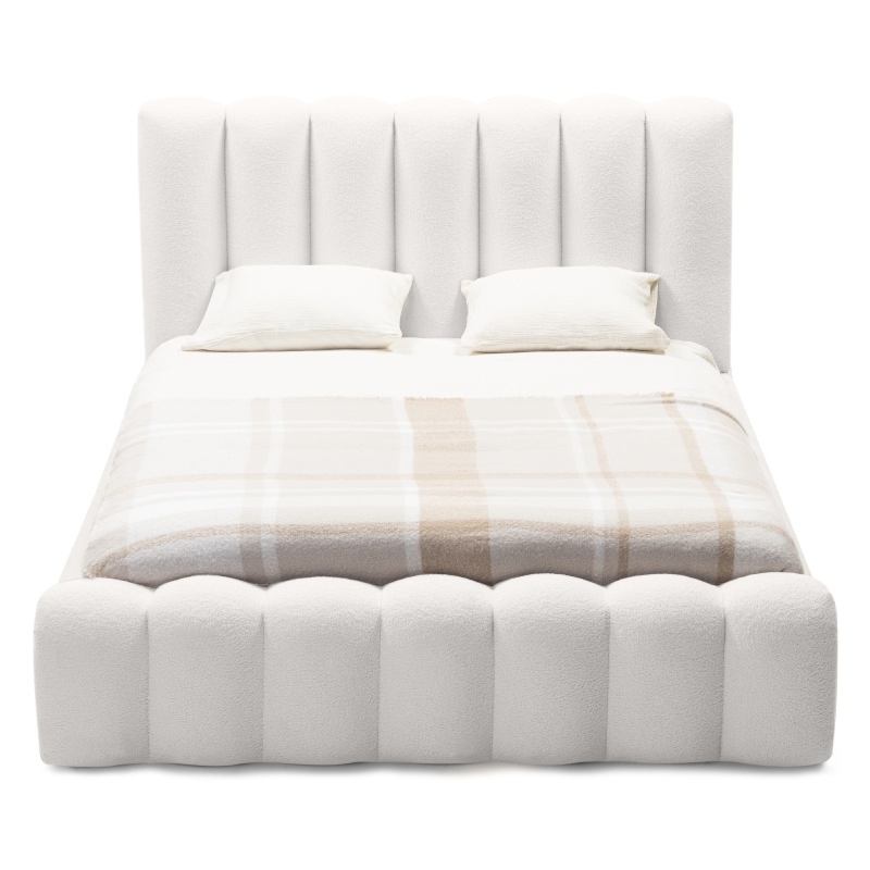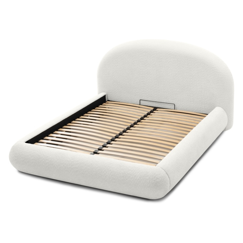 Łóżko Moona wyróżnia się niezrównanym komfortem i wyjątkowym designem. Jego obłe kształty i biała tapicerka boucle nadają wnętrzu lekkości i elegancji, wprowadzając jednocześnie nutę nowoczesności. Mebel stanie się centralnym punktem każdej sypialni, niezależnie od tego, czy preferujesz minimalistyczny, czy bardziej klasyczny styl.