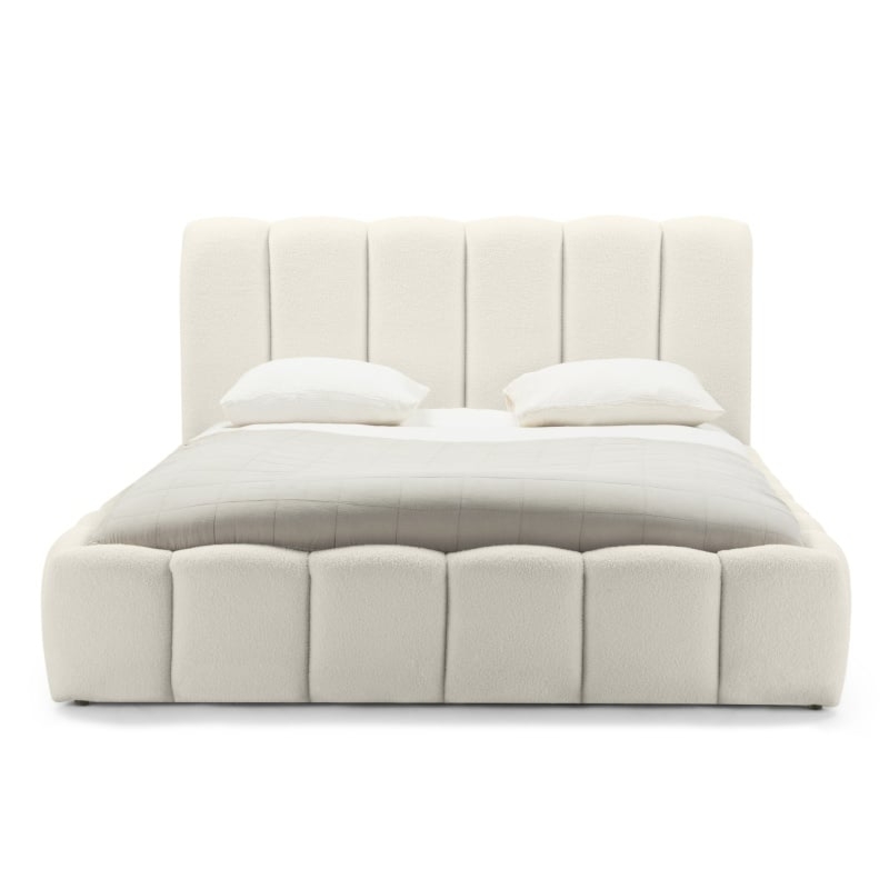 Łóżko Tulla wprowadzi nową jakość komfortu i stylu do Twojej sypialni. Jego zagłówek i zanóżek urzekają subtelnymi, falistymi liniami, które nadają im unikalną, organiczną formę. Niezwykle miękka tkanina boucle w jasnobeżowym odcieniu, tworzy ciepły i przytulny klimat, który sprzyja relaksowi. Ponadto materiał ten powstał z przędzy wyprodukowanej z recyklingowanych tworzyw, co przyczynia się do ochrony naszego wspólnego środowiska.