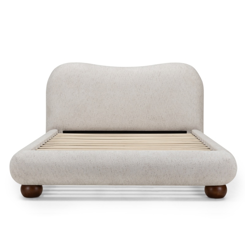 Łóżko Booli to doskonałe połączenie komfortu i estetyki, które wprowadza do każdego wnętrza przytulność i harmonię. Jego zaokrąglone kształty i miękka, jasnobeżowa tapicerka dodają subtelności, tworząc idealne miejsce do relaksu. Stylowe nóżki w formie kulek przyciągają wzrok, stanowiąc oryginalną ozdobę, która dodaje charakteru i nowoczesnego wyglądu.