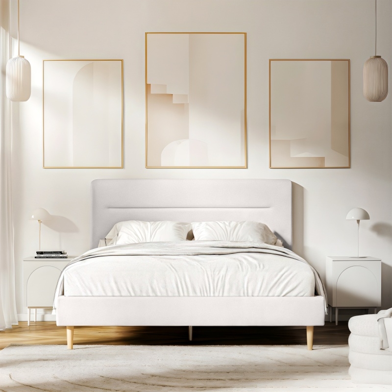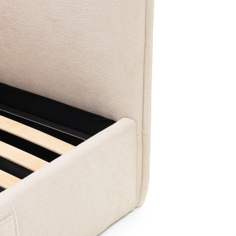 Łóżko zostało obite miękką tkaniną w ponadczasowym, beżowym odcieniu, dzięki czemu pasuje do wielu aranżacji wnętrz. Wysokie wezgłowie zapewnia nie tylko wyjątkowy wygląd, ale też wygodne podparcie podczas wieczornego relaksu z książką czy filmem.