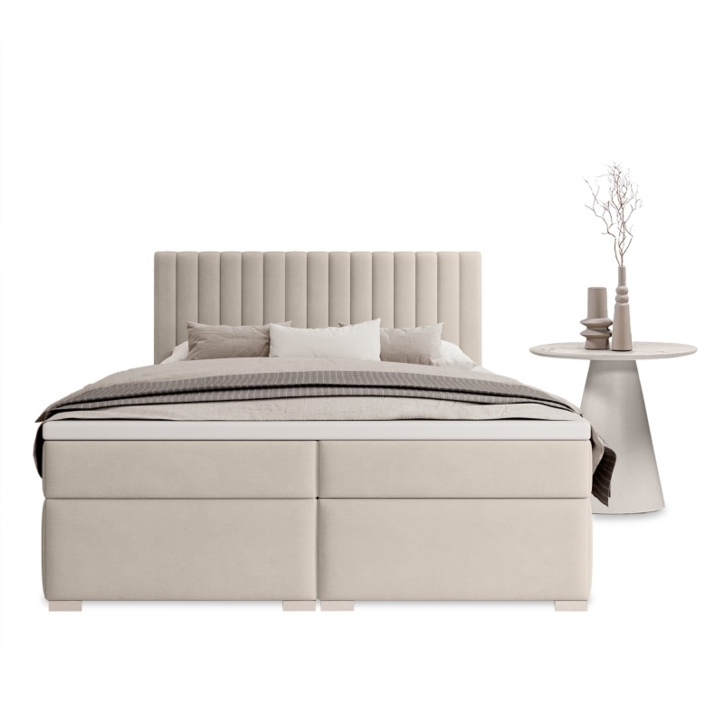 Jeśli chcesz cieszyć się komfortem nocnego wypoczynku, a równocześnie elegancką dekoracją sypialni, zdecyduj się na tapicerowane łóżko Vertical!Cechą wyróżniającą model Vertical jest wysoki zagłówek, który zadba o wyjątkową atmosferę relaksu w sypialni i sprawi, że w wygodny sposób obejrzysz ulubiony serial lub przeczytasz książkę. Znajdujące się na nim dekoracyjne przeszycia nadają całości wyrazistego charakteru. Dodatkowym atutem jest również praktyczny pojemnik, dzięki któremu przechowywanie pościeli, poduszek czy innych niezbędnych przedmiotów stanie się znacznie łatwiejsze.Materiałem obicia mebla jest miękka i przyjemna w dotyku tkanina welurowa Riviera utrzymana w uniwersalnym, beżowym kolorze. Masz dzięki temu gwarancję, że dopasujesz łóżko do większości aranżacji oraz łatwo dobierzesz do niego dodatki i dekoracje.