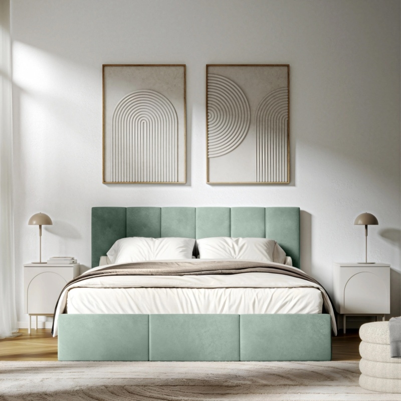 Jeśli chcesz cieszyć się komfortem nocnego wypoczynku, a równocześnie elegancką dekoracją sypialni, zdecyduj się na tapicerowane łóżko Vertical!Cechą wyróżniającą model Vertical jest wysoki zagłówek, który zadba o wyjątkową atmosferę relaksu w sypialni i sprawi, że w wygodny sposób obejrzysz ulubiony serial lub przeczytasz książkę. Znajdujące się na nim dekoracyjne przeszycia nadają całości wyrazistego charakteru. Dodatkowym atutem jest również praktyczny pojemnik, dzięki któremu przechowywanie pościeli, poduszek czy innych niezbędnych przedmiotów stanie się znacznie łatwiejsze.Materiałem obicia mebla jest miękka i przyjemna w dotyku tkanina welurowa Riviera utrzymana w modnym, pistacjowym zielonym kolorze.