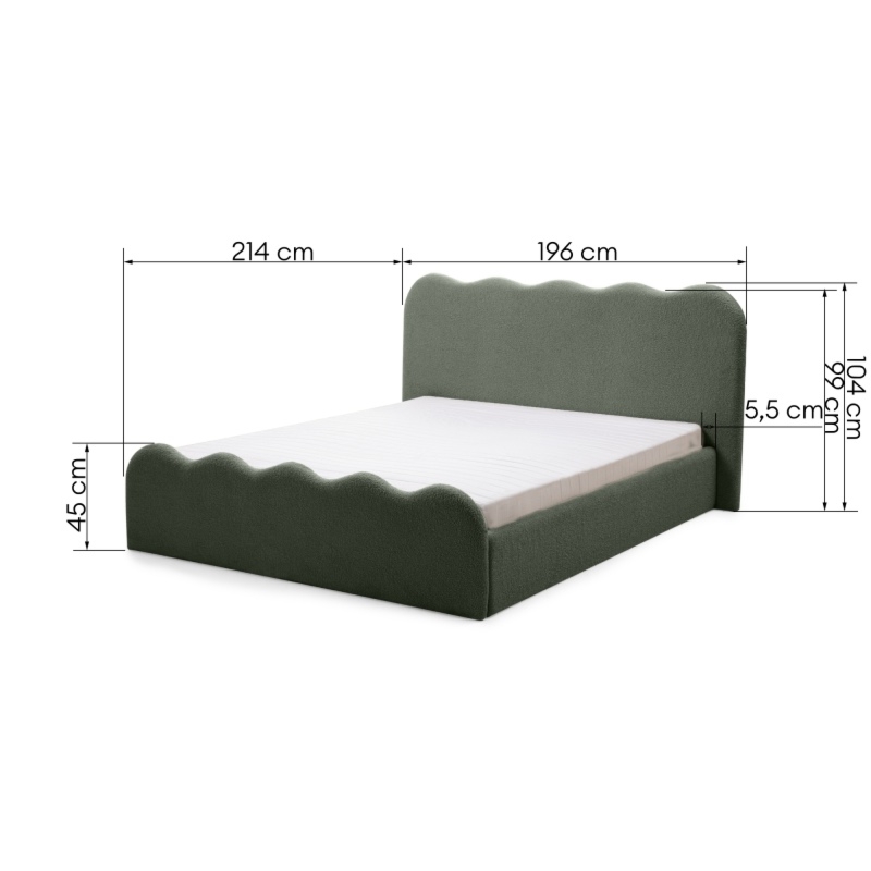 Łóżko Onda wprowadzi nową jakość komfortu i stylu do Twojej sypialni. Jego zagłówek urzeka subtelnymi, falistymi liniami, które nadają mu unikalną, organiczną formę. Niezwykle miękka tkanina boucle w ciemnozielonym odcieniu, tworzy ciepły i przytulny klimat, który sprzyja relaksowi. Ponadto materiał ten powstał z przędzy wyprodukowanej z recyklingowanych tworzyw, co przyczynia się do ochrony naszego wspólnego środowiska.