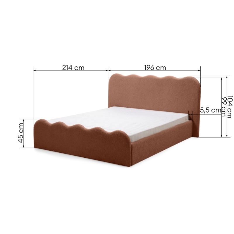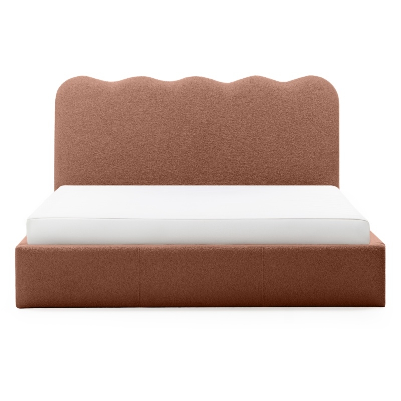 Łóżko Tulla wprowadzi nową jakość komfortu i stylu do Twojej sypialni. Jego zagłówek i zanóżek urzekają subtelnymi, falistymi liniami, które nadają im unikalną, organiczną formę. Niezwykle miękka tkanina boucle w miedzianym odcieniu, tworzy ciepły i przytulny klimat, który sprzyja relaksowi. Ponadto materiał ten powstał z przędzy wyprodukowanej z recyklingowanych tworzyw, co przyczynia się do ochrony naszego wspólnego środowiska.
