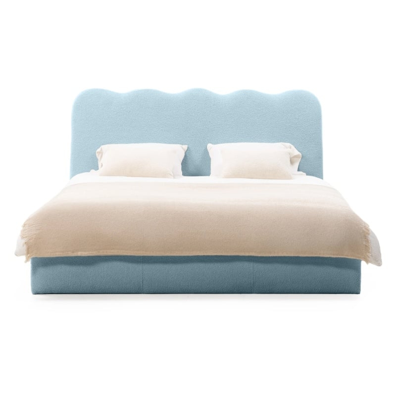 Łóżko Tulla wprowadzi nową jakość komfortu i stylu do Twojej sypialni. Jego zagłówek i zanóżek urzekają subtelnymi, falistymi liniami, które nadają im unikalną, organiczną formę. Niezwykle miękka tkanina boucle w niebieskim odcieniu, tworzy ciepły i przytulny klimat, który sprzyja relaksowi. Ponadto materiał ten powstał z przędzy wyprodukowanej z recyklingowanych tworzyw, co przyczynia się do ochrony naszego wspólnego środowiska.