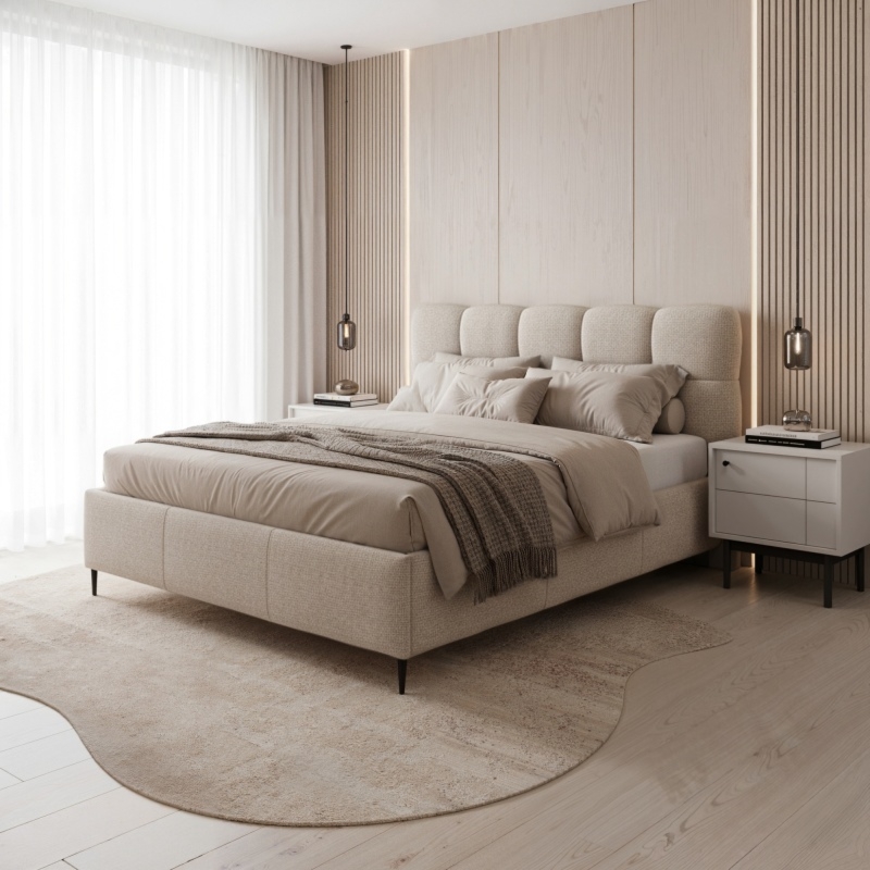 Łóżko Zeni to idealne połączenie nowoczesnego designu z klasyczną elegancją. Obite miękką, szenilową tkaniną w beżowym odcieniu, wprowadza do sypialni lekkość i harmonię, pasując zarówno do wnętrz minimalistycznych, jak i tych bardziej klasycznych.