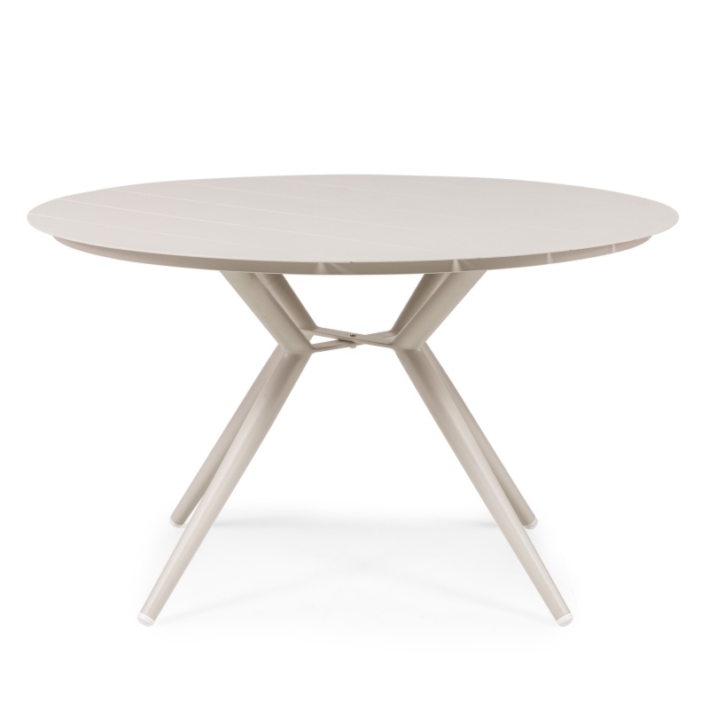 Jego solidna, aluminiowa konstrukcja, pokryta malowaniem proszkowym, zapewnia nie tylko estetyczny wygląd, ale również odporność na zarysowania i korozję. Okrągły blat tworzy idealną przestrzeń do wspólnych posiłków, a cztery solidne nogi zapewniają stabilność, gwarantując wygodę użytkowania.