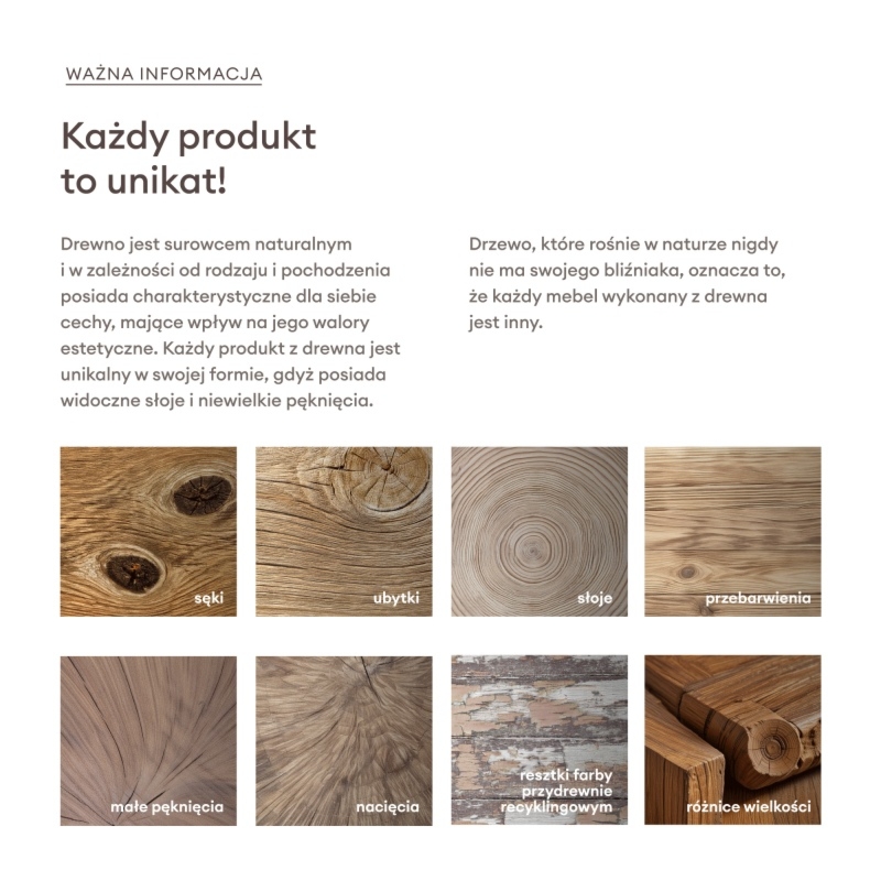 Meble wykonane z naturalnego drewna zachowują jego charakterystyczne cechy, dlatego wszelkie nierówności, przetarcia, rysy, sęki, pęknięcia, szczeliny, dziurki, zagłębienia, nierówne krawędzie, różnorodne usłojenia, różnice kolorystyczne oraz inne nieregularności w strukturze są celowo zachowane podczas procesu produkcji. Właściwości te, podkreślają autentyczność materiału, nadając każdemu naszemu produktowi unikalny charakter, co może skutkować różnicami w wyglądzie w stosunku do prezentowanych zdjęć.