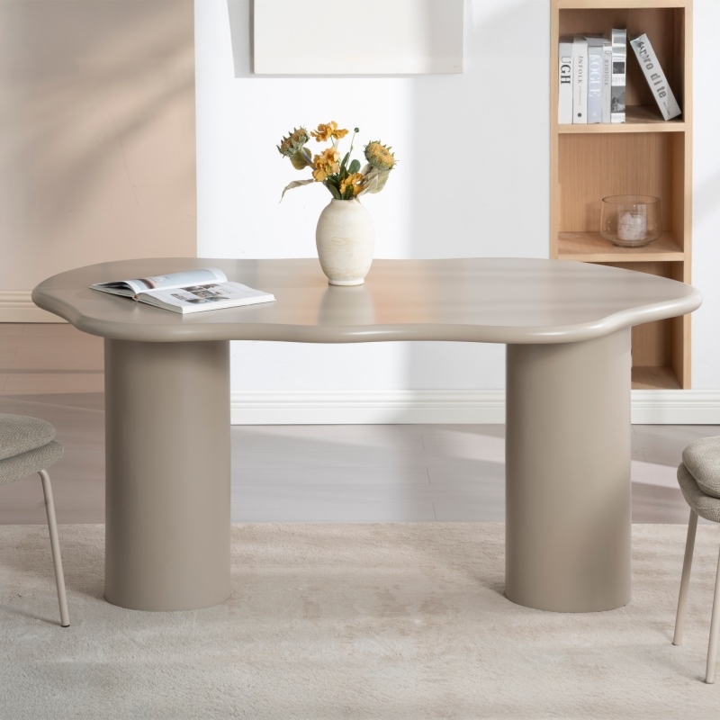 Solidne nogi w unikalnym, oryginalnym kształcie to prawdziwa ozdoba stołu. Dzięki nim stół zyskuje nie tylko stabilność, ale i wyjątkowy charakter. Ciemnobeżowy kolor wprowadza do pomieszczenia harmonię, doskonale komponując się z różnorodnymi stylami aranżacyjnymi – od nowoczesnych po klasyczne.