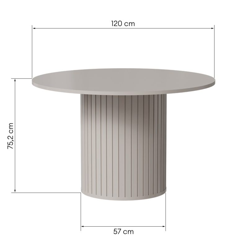 Cztery solidne, cylindryczne nogi to nie tylko solidny fundament stołu, ale i subtelny detal, który nadaje mu charakter i stabilność. Matowe wykończenie w ciemnobeżowym kolorze harmonijnie komponuje się z różnymi aranżacjami, wprowadzając do wnętrza wyważony, nowoczesny akcent.