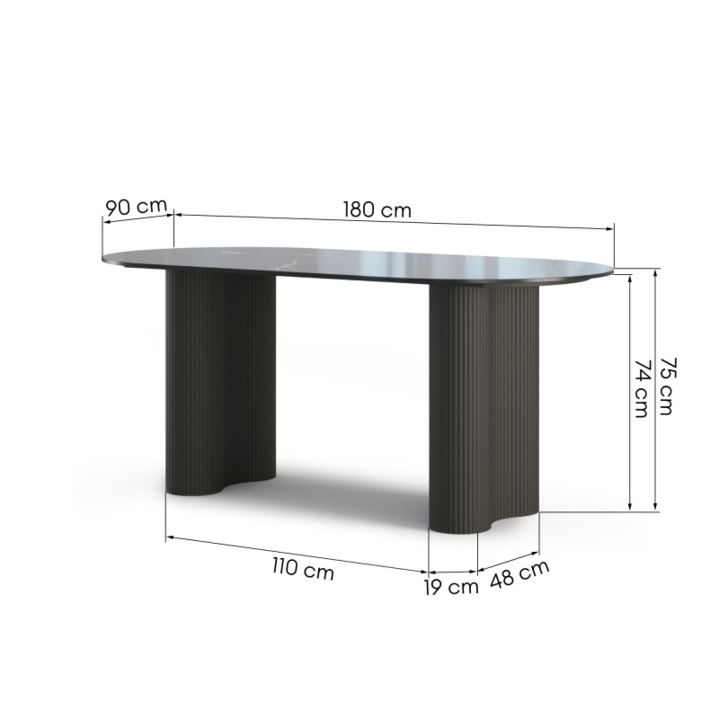 Odkryj niepowtarzalne połączenie elegancji i funkcjonalności z naszym stołem do jadalni Ribeira. Ten wyjątkowy stół jest nie tylko praktyczny, ale także zachwycający swoim designem, który idealnie wpisuje się w nowoczesne trendy aranżacyjne.Ribeira prezentuje się wyjątkowo dzięki swojemu owalnemu kształtowi, nadając przestrzeni jadalnianej przytulności i harmonii. To jednak nie wszystko – blat stołu wykonany jest ze spieku, stworzonego wyłącznie z naturalnych materiałów. Dzięki temu uzyskujemy efekt, który przypomina wygląd marmuru, jednak z dodatkowymi korzyściami w zakresie pielęgnacji. Czarna podstawa z płyty MDF dodaje lekkości, a dekoracyjne lamele nadają mu nowoczesny charakter. To nie tylko solidna konstrukcja, ale także element, który nadaje stołu unikalności.Zapewnij swojej przestrzeni jadalnianej nowoczesny i elegancki akcent, inwestując w stół Ribeira już dziś!