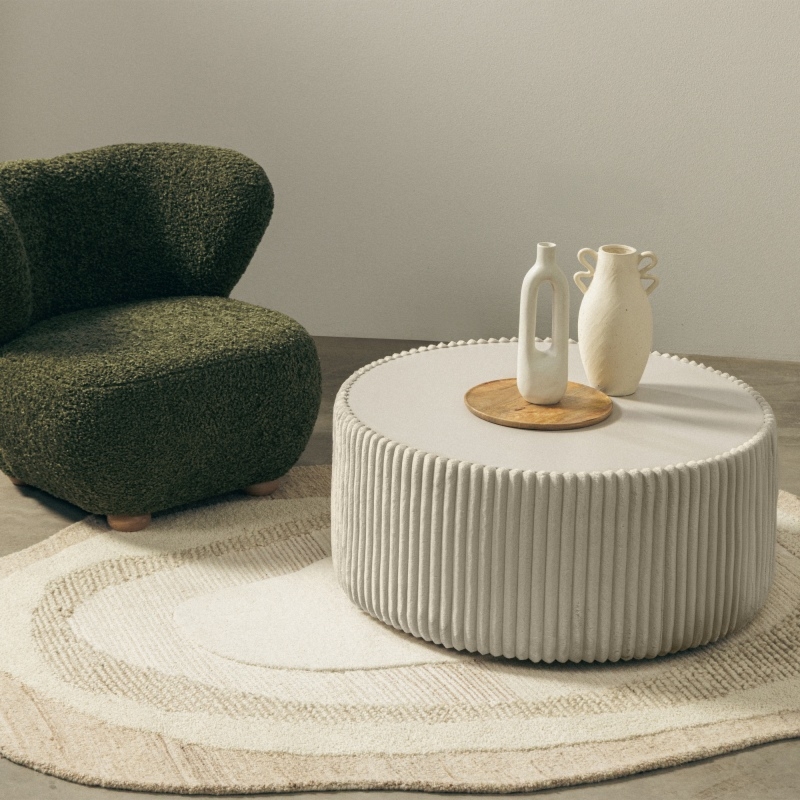Stylowy, przytulny i funkcjonalny – stolik kawowy Mio Round to wyjątkowy element wystroju, który przyciąga spojrzenia. Jego miękka, tapicerowana podstawa z tkaniny sztruksowej nie tylko zachwyca wyglądem, ale jest również niezwykle przyjemna w dotyku i odporna na codzienne użytkowanie. Blat w dekorze Piasku Pustyni nadaje mu elegancki charakter, tworząc idealną przestrzeń na filiżankę kawy czy dekoracje. Okrągła, subtelna forma doskonale komponuje się z różnymi aranżacjami. Mio Round to więcej niż stolik – to nietuzinkowy akcent, który wnosi do wnętrza styl i charakter.