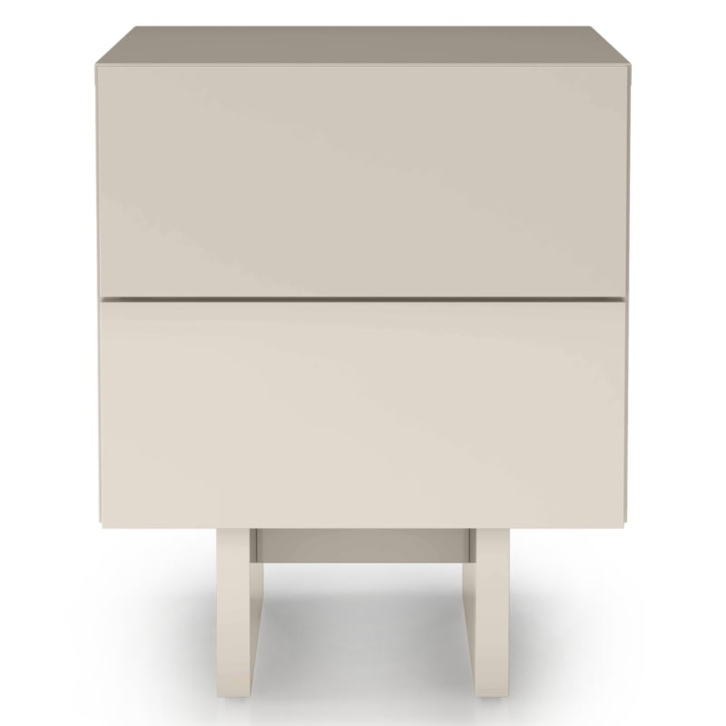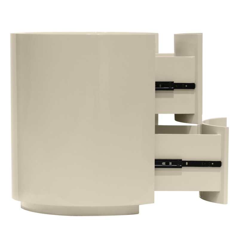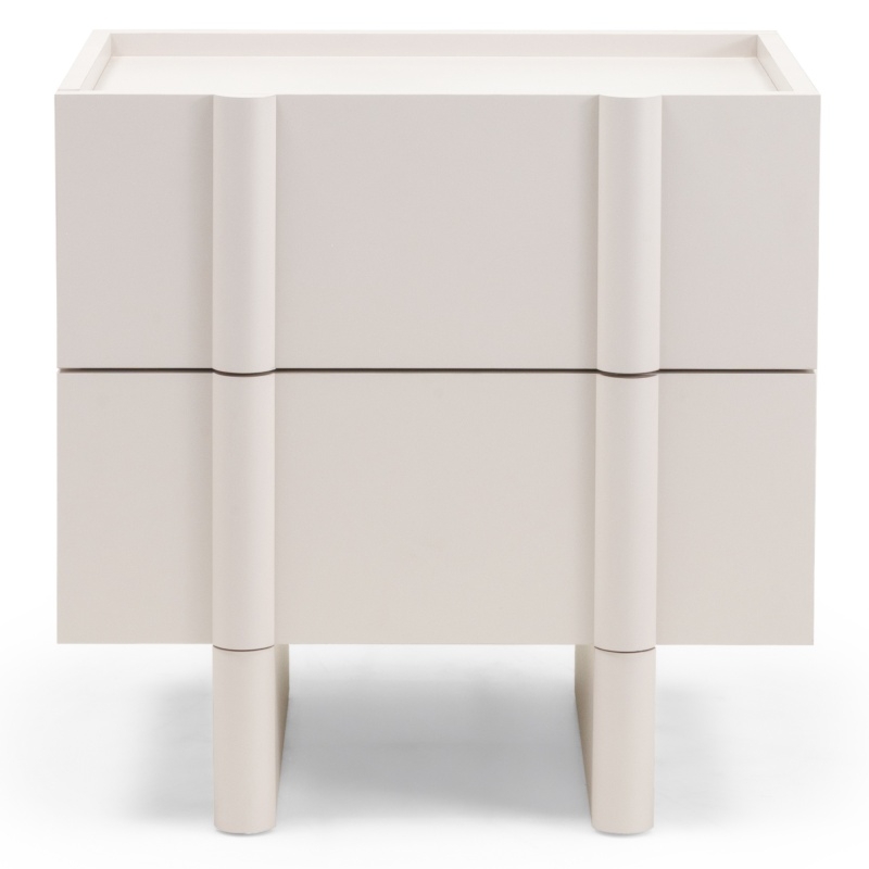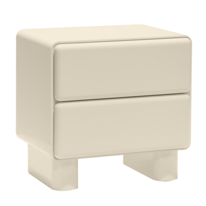 Szafka nocna Lagos łączy nowoczesną elegancję z subtelną lekkością. Jej zaokrąglone krawędzie wprowadzają do sypialni harmonię, łagodząc ostre linie wnętrza. Wyjątkowa kolorystyka łączy klasyczną biel z kremowym odcieniem, tworząc barwę pełną subtelności i naturalnego uroku. Wysoki połysk podkreśla elegancję mebla, nadając mu subtelny, a jednocześnie efektowny akcent dekoracyjny. Dwie pojemne szuflady zapewniają praktyczną przestrzeń do przechowywania, zachowując minimalistyczny i estetyczny wygląd. Lagos to propozycja dla osób ceniących funkcjonalność w designerskiej formie.