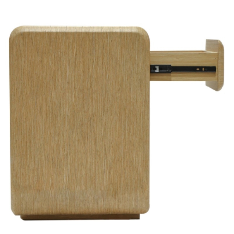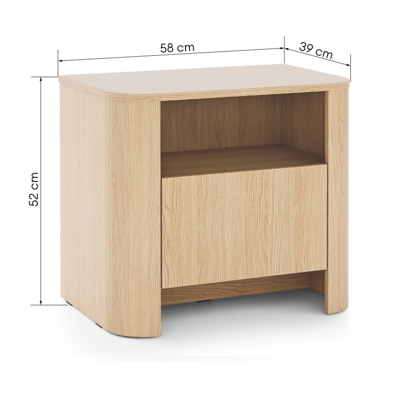 Szafka nocna Nox wyróżnia się nowoczesną formą, opartą na płynnie poprowadzonych liniach i miękkich, zaoblonych krawędziach. Jej wykończenie w kolorze naturalnego dębu ociepla przestrzeń i pięknie eksponuje subtelny rysunek słojów dodając całości naturalnego, wyważonego charakteru. Pojemna szuflada pozwala zachować porządek i dyskretnie przechować codzienne drobiazgi, nie zaburzając minimalistycznej kompozycji. Jednolita, obła sylwetka mebla wprowadza do wnętrza lekkość i harmonię, dzięki czemu Nox staje się eleganckim, nienachalnym akcentem zarówno w nowoczesnych, jak i bardziej klasycznych aranżacjach.