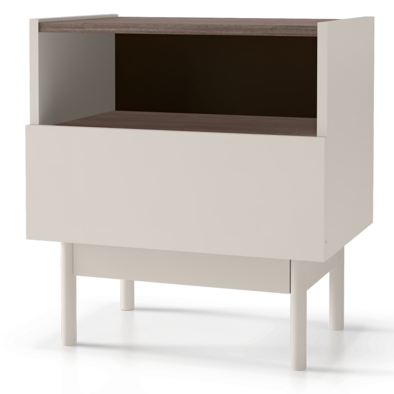 Szafka nocna Berula to połączenie prostoty i elegancji. Subtelny kaszmir zestawiony z głębokim, orzechowym wybarwieniem tworzy wyważoną kompozycję pełną ciepła i harmonii. Gładkie, bezuchwytowe fronty nadają całości nowoczesnego charakteru, a kontrast barw podkreśla jej wyjątkowy design.