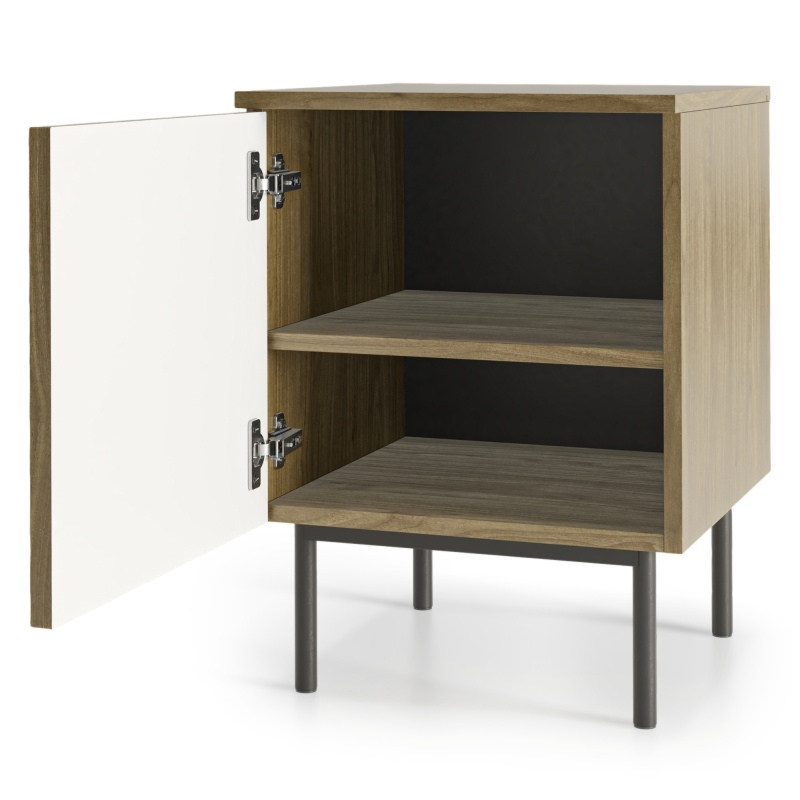 Czarne, drewniane nóżki zapewniają stabilność i lekkość konstrukcji, tworząc ciekawy kontrast z jasnym wykończeniem mebla. Front z delikatnym frezem przyciąga wzrok i podkreśla staranność wykonania. Dzięki zawiasom z cichym domykiem, otwieranie i zamykanie drzwiczek jest płynne i bezgłośne. Wewnątrz znajduje się jedna zamykana szafka, która pomoże w przechowywaniu różnych przedmiotów, dbając o porządek w sypialni.