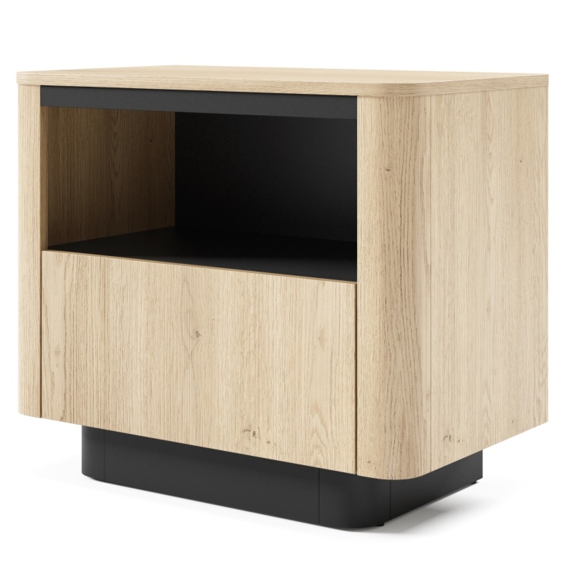 Wybarwienie w odcieniu dąb cremona, przełamane akcentami głębokiej czerni, nadaje szafce Torro wyjątkowy charakter. Delikatnie zaoblone boki wprowadzają do formy subtelną miękkość, a pojemna szufla i otwarta półka pomagają zachować porządek wokół łóżka.