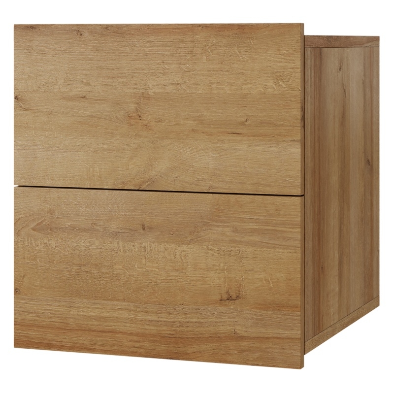Szafka wyposażona jest w pojemną szufladę na prowadnicach kulkowych z pełnym wysuwem i systemem push to open oraz otwartą półkę, w których schowasz wszystkie drobiazgi. Niezwykły dekor dąb vicenza jest elegancki i wprowadza do wnętrza przytulną atmosferę, która pozwoli Ci się zrelaksować po ciężkim dniu.