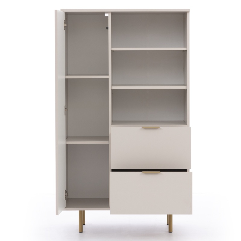 Nubia to witryna, która zachwyca od pierwszego wejrzenia. Jej beżowa konstrukcja nadaje wnętrzu delikatności i subtelnego uroku. Nubia została wyposażona w złote nóżki i uchwyty, a na jej froncie znajdziesz dekoracyjne ryflowanie, które sprawia, że mebel prezentuje się niezwykle elegancko.Nubia to nie tylko piękno, ale także funkcjonalność. Witryna wyposażona jest w zamykaną szafkę oraz dwie pojemne szuflady, w których bez trudu przechowasz swoje dekoracje i różne inne akcesoria. Dodatkowo, witryna posiada dwie półki, na których wyeksponujesz swoje ulubione ozdoby i pamiątki. Daj swojemu wnętrzu nowe życie i stwórz stylowe otoczenie, w którym z przyjemnością spędzisz czas z rodziną i przyjaciółmi. Wybierz witrynę Nubia i ciesz się harmonią oraz funkcjonalnością w swoim salonie.