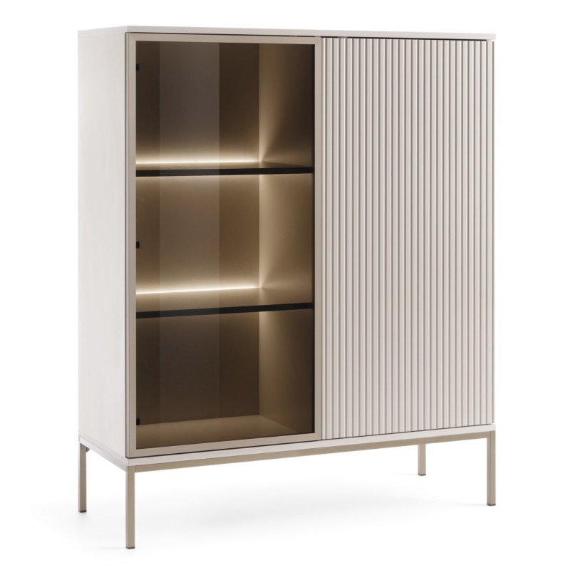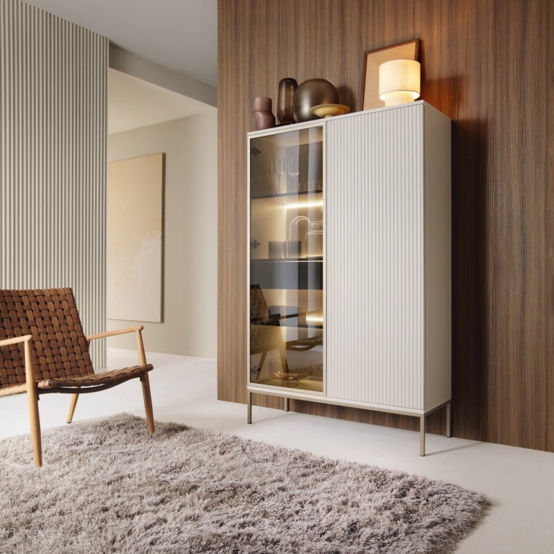 Sento to witryna, która zachwyca swoim frezowanym frontem wykonanym w kolorze kaszmirowym, który nadaje meblowi niepowtarzalnego uroku, wprowadzając do Twojego wnętrza nutę elegancji i przytulności. Korpus utrzymany w kolorze szampańskim, idealnie komponuje się z całością, dodając jej wyjątkowego charakteru.Jedne drzwi wyposażone w hartowane szkło to nie tylko estetyczny akcent, ale także praktyczne rozwiązanie. Pozwala ono na subtelne eksponowanie wybranych przedmiotów wewnątrz witryny, dodając elegancji Twoim ulubionym dekoracjom czy kolekcjom. Wnętrze zostało zaprojektowane z myślą o maksymalnej funkcjonalności. Półki pozwalają na łatwą organizację i przechowywanie Twoich cennych przedmiotów czy drobiazgów. Dodatkowo, oświetlenie LED nadaje meblowi niezwykłego blasku, eksponując zawartość witryny i dodając jej wyjątkowego charakteru.