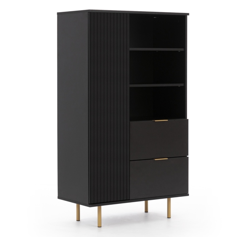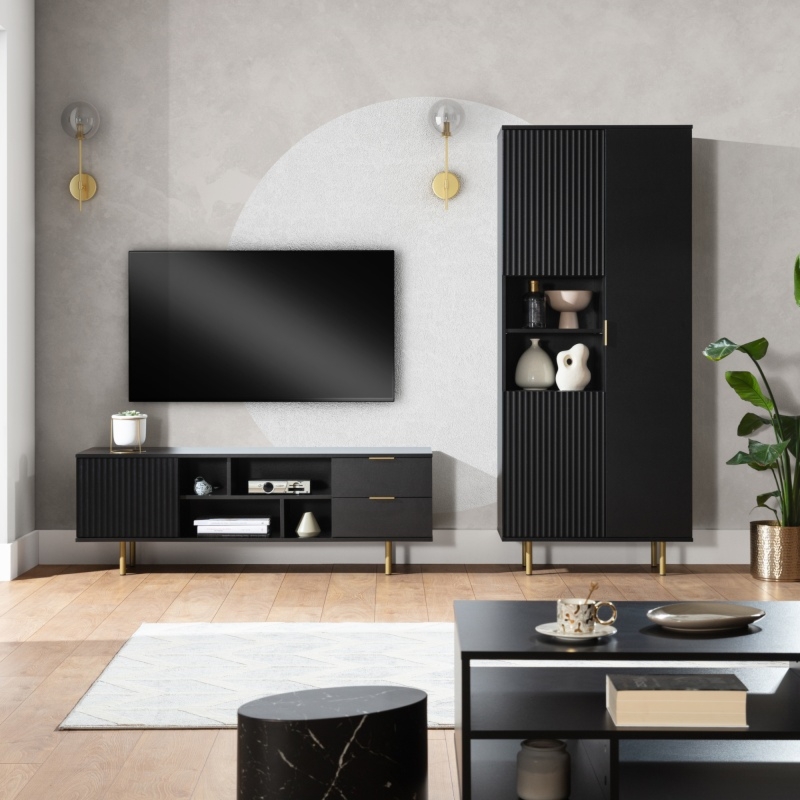 Nubia to witryna, która zachwyca od pierwszego wejrzenia. Jej czarna konstrukcja nadaje wnętrzu elegancji i nowoczesnego uroku. Nubia została wyposażona w złote nóżki i uchwyty, a na jej froncie znajdziesz dekoracyjne ryflowanie, które sprawia, że mebel prezentuje się niezwykle szykownie.Nubia to nie tylko piękno, ale także funkcjonalność. Witryna wyposażona jest w zamykaną szafkę oraz dwie pojemne szuflady, w których bez trudu przechowasz swoje dekoracje i różne inne akcesoria. Dodatkowo, witryna posiada dwie półki, na których wyeksponujesz swoje ulubione ozdoby i pamiątki. Daj swojemu wnętrzu nowe życie i stwórz stylowe otoczenie, w którym z przyjemnością spędzisz czas z rodziną i przyjaciółmi. Wybierz witrynę Nubia i ciesz się harmonią oraz funkcjonalnością w swoim salonie.